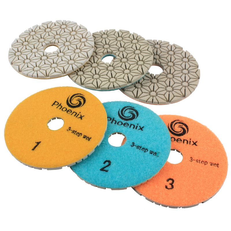 Thanks to our innovative breakthrough, these 3 Step Polishing Pads boast the highest possible diamond concentration, eliminating the need to sacrifice speed, polish, or lifespan. Crafted with the finest diamonds, featuring multiple angles and a unique "Polycrystalized" internal shape, our wet polishing pads are designed for efficiency. The diamonds break easily during polishing, continuously revealing new angles for prolonged pad life and exceptional speed.